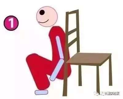 靠椅蹲:保护膝关节用自己的背部、腰骶部依靠椅背,臀部不要低于膝盖,下蹲后保持不动。练习时间可以逐渐延长,以 2~4 分钟为宜,有保护膝关节的功效。