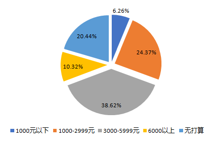 其中打算花费6000元以上的被访者占到10.32%;花费3000-5999元的被访者为最大群体,占比为38.62%;准备花费1000-2999元的被访者占24.37%。