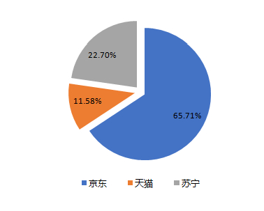 天猫占据28%的家电线上销售份额,苏宁易购占据9.4%,小米、亚马逊和国美在线等其他电商平台相加占据1.3%的份额,比重较小。所以以下调查对象以这3个家电电商平台为主。