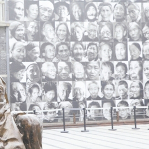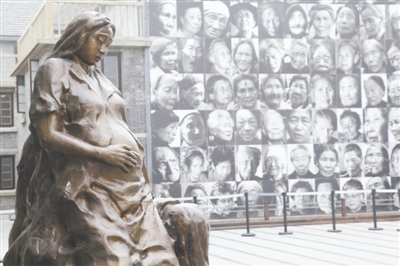 题图:江苏省南京市,利济巷慰安所旧址陈列馆,“慰安妇”主题雕塑和后面的慰安妇照片墙。
