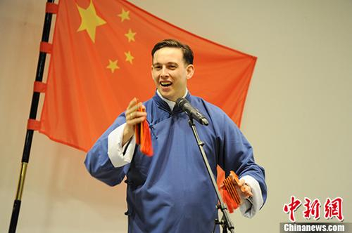 图为在德国华人圈中颇有名气的德国小伙儿倪克在以中德文客串主持之余,亦表演了拿手绝活——快板《武松打虎》。 中新社记者 彭大伟 摄