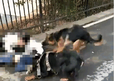 视频中:一位老人和一个小孩子倒在地上,遭到两只恶狗的疯狂撕咬。老人拼命保护被咬的孩子,发出撕心裂肺的哭喊,令人揪心……