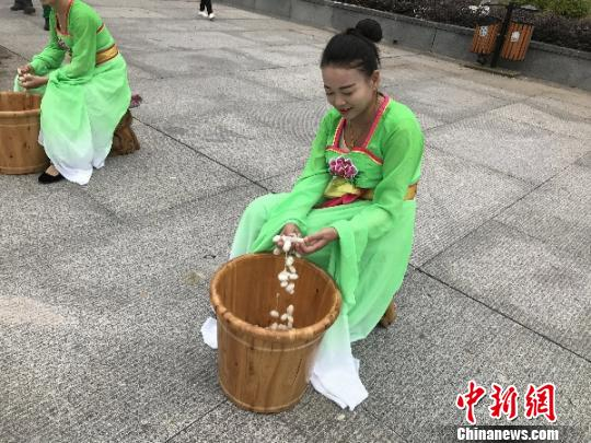在嫘祖陵广场,现场展示选蚕茧。 杨勇 摄