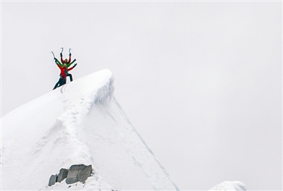 凌晨3点,曾山从帐篷里钻出来,借着电筒的亮光,朝着雀儿山的东顶发起“冲锋”。一道400多米的山脊,随着天色渐渐变亮而愈发冷峻,曾山手拿冰镐,小心翼翼攀着冰壁,朝着顶端行进。刀锋一样的山脊,在狭窄的地方只能骑在上面,慢慢向前移动,两边都是万丈深渊。