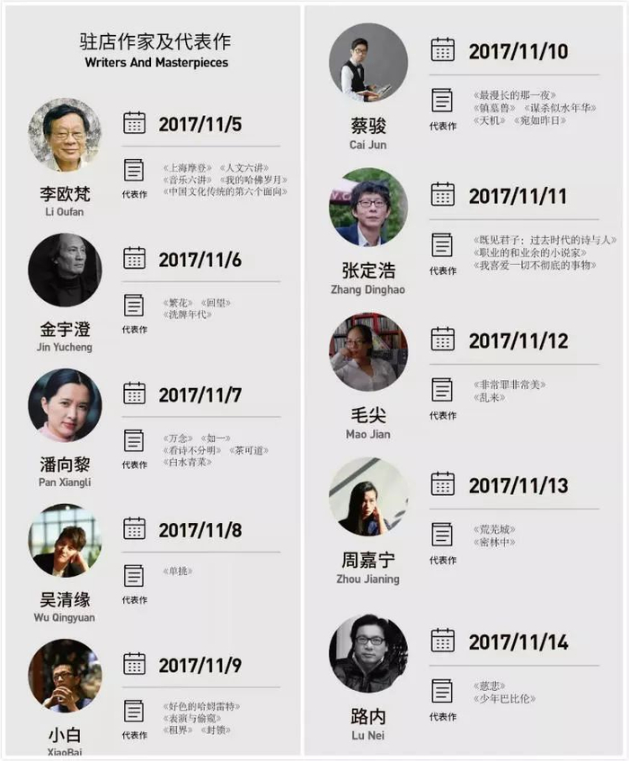 接下来来访的首批作者是,《繁花》作者金宇澄、潘向黎、吴清缘、小白、蔡骏、张定浩、毛尖、周嘉宁、路内(按时间顺序排列)。主办方采取了每次公布十位的模式,可以说给我们留足了惊喜。