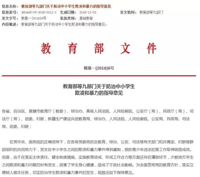 教育部联合中央综治办、最高人民法院、最高人民检察院、公安部等九部门印发的《关于防治中小学生欺凌和暴力的指导意见》,要求加强教育预防、依法惩戒和综合治理,切实防治学生欺凌和暴力事件的发生。