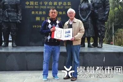 中国红十字会救护总队图云关旧址纪念碑前,将汤蠡舟先生留下的珍贵历史资料捐赠给南明区保存。