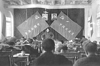 眼前的这间屋子里,台上悬挂着毛泽东同志和朱总司令的照片,两面墙上悬挂着党旗。1949年,中国共产党七届二中全会就是在这里召开的。