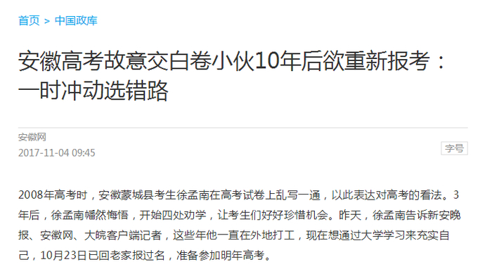“我想获取一个比较好的学习环境来提升自己,也算弥补当初没有上大学的缺憾。我想体验一下大学的生活。”徐孟南说,“这次高考,肯定不会再交白卷了。如果当初有过来人劝我,我可能也不会去交白卷。” 徐孟南说,他现在边打工边复习,希望明年能考出一个好成绩。