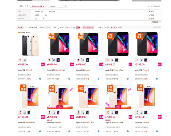 记者在天猫苏宁旗舰店上看到,为迎接即将到来的“双11”,国行金色64GB版iPhone 8付100元定金可抵1200元,再抢一张100元的券,最后11月11日当日购买到手价4688元。国美官网上,国行金色、银色64GB版iPhone 8售价为4888元,比原价5888元便宜1000元,大部分地区可立即购买。而京东上,国行金色64GB版iPhone 8的折后成交价为4777元。
