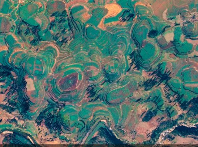 寻甸县地处云南省东北部,是滇东北之要冲。县境内地势西北高,东南低,呈向东南倾斜阶梯状。这幅色彩斑斓的影像正是这种倾斜的地貌与缠绕在山间的公路共同作用的结果,虽凌乱错落,但却不失美感,是一幅优秀的“艺术作品”。
