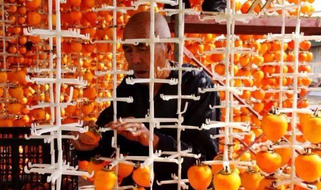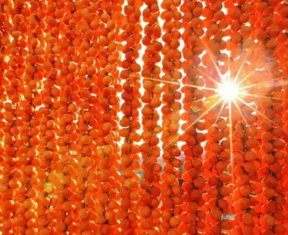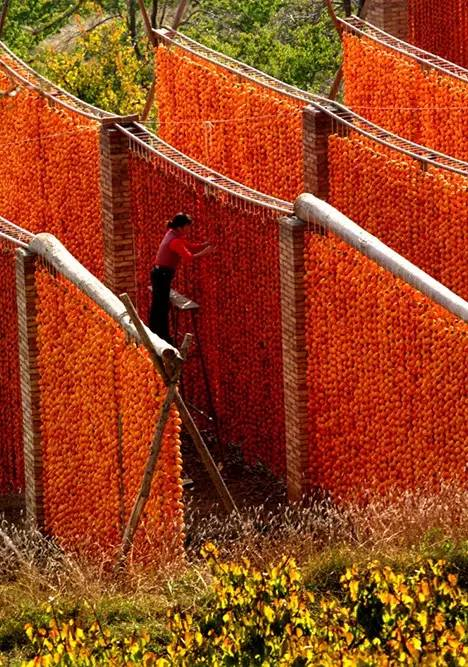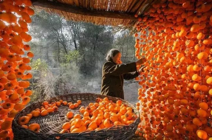 每年10月底至11月底,山里乡间,柿子被串得满满,挂在了三人高的架子上晾晒,火红柿子,壮观的晒柿子场面,处处都透出一种浓烈的、洒脱。