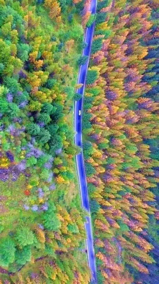 秋日斑斓的色彩从公路两旁一直延伸到远处的山上,就像童话中的世界。满山的红叶、层层的群山,构成了一幅经典的大山水墨画。