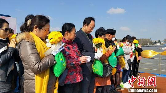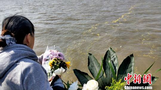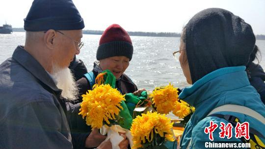 逝者亲属向江中抛洒菊花寄托思念 夏莹 摄
