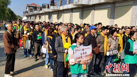工作人员为逝者亲属整理黄围巾 夏莹 摄