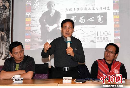 中华台北书法家协会监事主席、台湾少数民族书法家谢石鸿为书法爱好者作“书为心宽”书法讲座。 记者刘可耕 摄