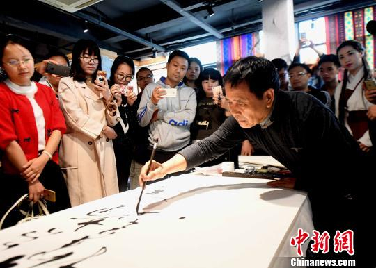 台湾少数民族书法家谢石鸿现场挥毫题写书法作品。 记者刘可耕 摄