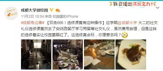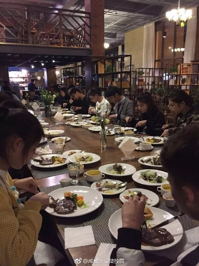 为了让学生实地学习用餐等社交礼仪,成都大学社交礼仪选修课把课堂搬到了学校的西餐厅里,一边吃看,一边听老师讲解汤勺的方向、坐姿、刀叉使用…既能学到内容,又能填饱肚子!