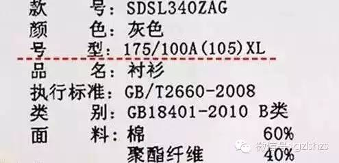 号型中没有标明身高和胸围的衣服是不合格的。合格衣服的号型标注:“175/100A”,175表示身高、100表示胸围、A表示体型。A表示“正常”、B表示“偏胖”、C表示“胖”、Y表示“偏瘦”。