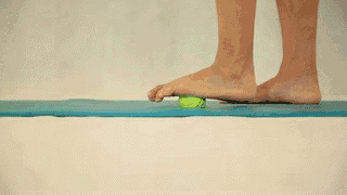 脱掉鞋,把一个网球大小的球状物顶在脚心,来回滚动一两分钟,这样能够帮助你防止足弓抽筋或者过度疲劳。