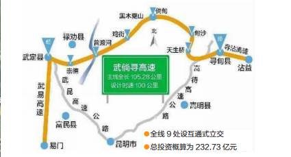 该项目起自武定县杨柳河村,接武定至易门高速公路,与京昆高速公路交叉,通过武易高速的武定枢纽互通进行交通转换,止于寻甸县天生桥,接嵩待高速公路,远期接拟建的寻甸至沾益高速公路。