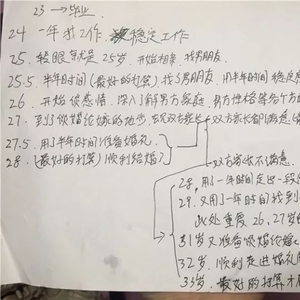 在网络上热传的是一张用黑色签字笔手写的时间表,时间表列出了一个人从23岁大学毕业开始计划的感情变化时间。