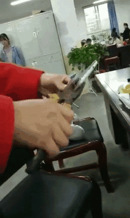 据视频画面,拍摄地似乎为学校办公室,一名身穿红色外套的女子边说话边用钳子夹一部手机。由于非常用劲,不时发出“咔咔”的声音,手机屏幕也已出现裂痕。