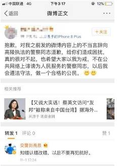 微博很快引起了民警注意,11月1日,交警高陵大队向公安高陵分局崇皇派出所报案,次日该女子被警方传唤,承认两次发布不当言论。考虑到她能主动将微博删除,并公开道了歉,警方根据《治安管理处罚法》的相关规定,对其进行了批评教育。