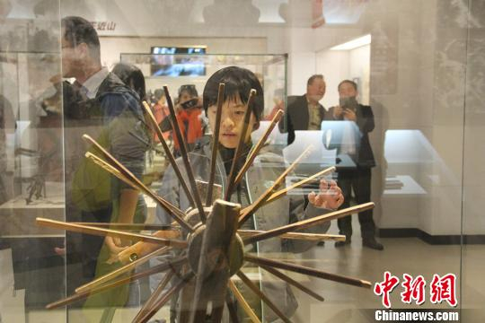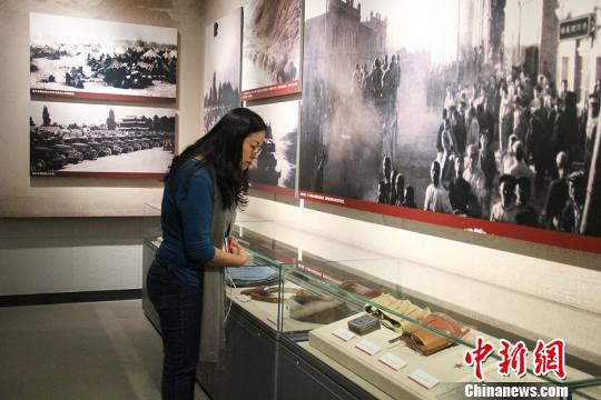 图为新西兰中华新闻通讯社副总编任雪冬认真观看纪念馆的展品。 袁晶 摄