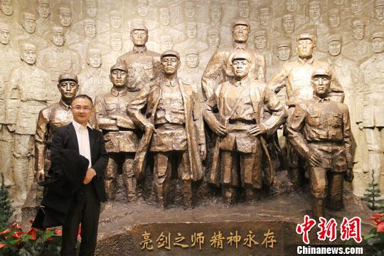 图为海外华文媒体代表与将军纪念馆内雕塑合影。 袁晶 摄