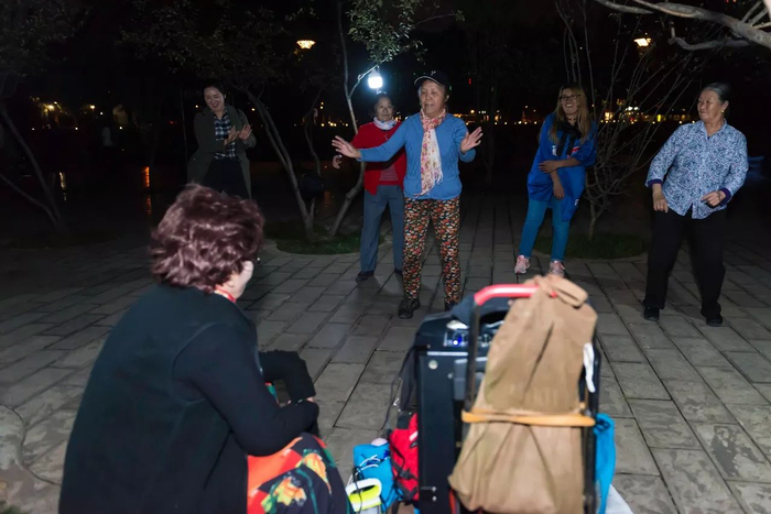 跳舞的人老中青皆有,领头的是年过七旬的老人张东。她每周五到周末的晚上,都会带着一群老年人蹦迪、尬舞。比广场舞更具活力的蹦迪,吸引了不少年轻人,甚至是外国人的参与。