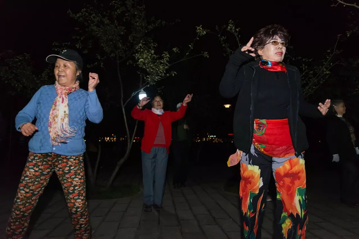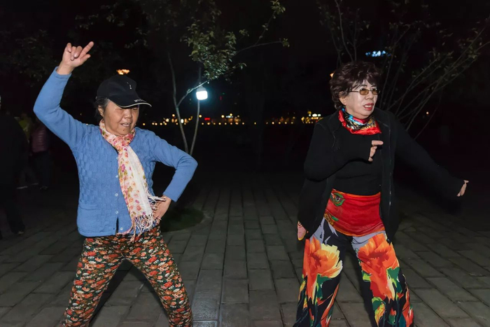 虽然黑衣大妈体型微胖,但很灵活,前进、后退、转圈、扭腰一气呵成,活像个十七八岁的少女。一曲舞毕,黑衣大妈坐回音响旁的小凳子,喝了一口水。