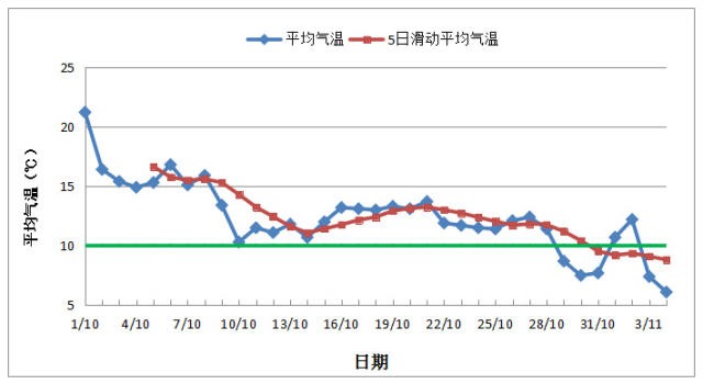 中华人民共和国气象行业标准——《气候季节划分》规定:基于当年气温序列计算5天滑动平均气温构成滑动平均气温序列,当滑动平均气温序列连续5天小于10℃,则以其所对应的当年气温序列中第一个小于10℃的日期作为冬季起始日,如果初次判断的起始日期比常年偏早15天以上,需进行起始日的二次判断。