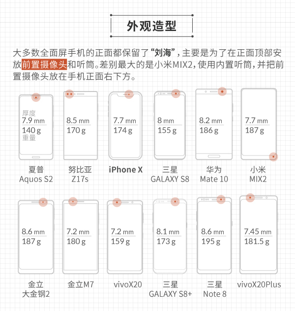 iPhone X的“刘海”造型在刚一推出时颇受争议,但这样的做法在全面屏手机中不在少数,这主要是为了给手机听筒和前置摄像头保留位置。