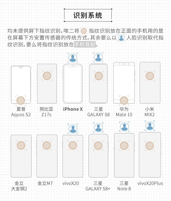 最为极端的是iPhone X,为坚守在手机正面解决识别解锁的问题,它彻底弃用了指纹识别,改换成人脸识别解锁。另一种主流做法是将指纹识别按钮放置在手机背部。在我们统计的12款全面屏手机中,这种做法占到了四分之三。可见,屏幕下植入指纹识别的技术仍是难题。