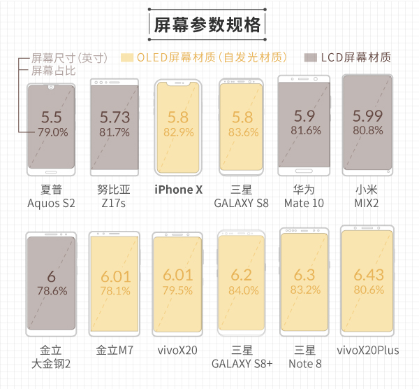 全面屏成为潮流使LCD和OLED两种屏幕材质分道而行。在目前的主流全面屏手机中,采用LCD材质的主要有小米、华为和金立,采用OLED的主要有三星、苹果和vivo。