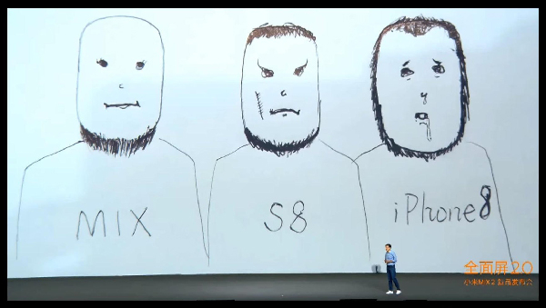 小米科技董事长兼CEO雷军在9月11日的小米MIX2发布会上引用了一张网友画的漫画,试图表现三款全面屏手机在设计上的区别。可以说,这三款手机也刚好代表了各厂商为增大手机屏占比而采取的三种“变脸”方式。