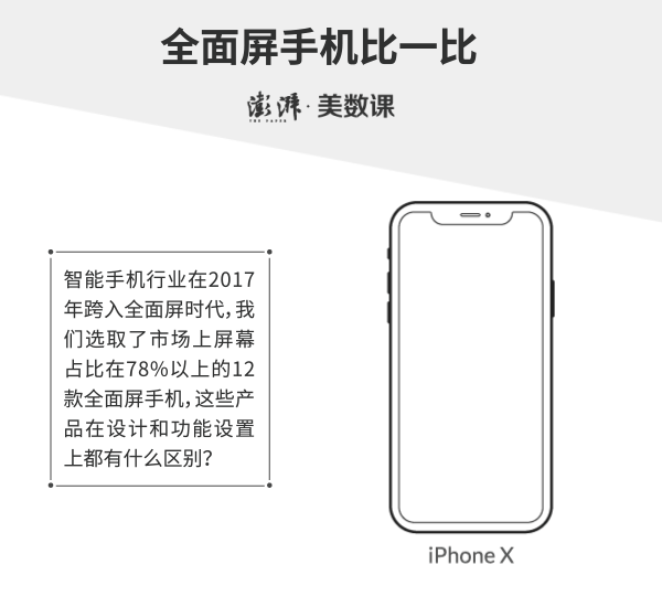 全面屏手机的终极追求,是手机正面完全由一块显示屏构成。但厂商和行业需要做的改变却不仅仅是屏幕本身。澎湃新闻(www.thepaper.cn)选取了目前市面上屏占比(即屏幕面积占手机前面板面积的比例)在78%以上的12款主流全面屏手机,来对比观察各全面屏手机在设计和功能上差异。