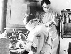 1912年2月间,伍连德在临时实验室内观察显微镜下的微生物样本