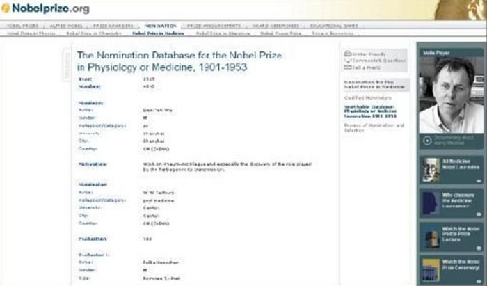 诺贝尔基金会官方网站关于伍连德的相关信息