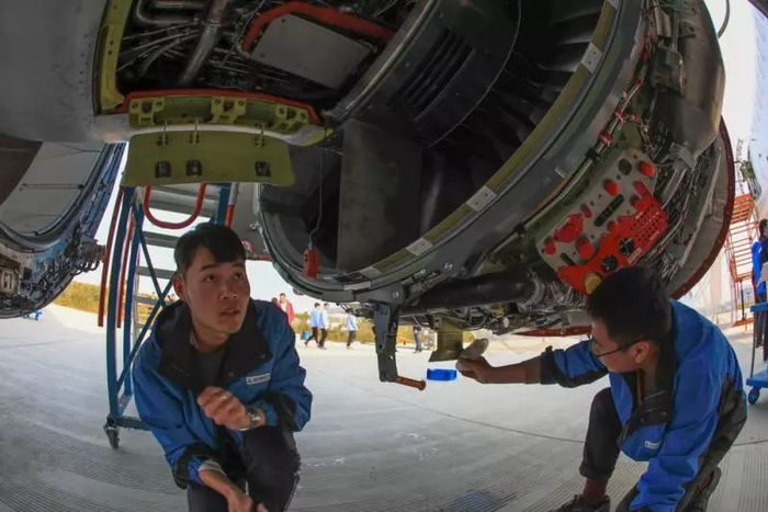 技术人员正在对第二架C919进行发动机点火前的准备工作。