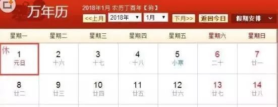 2018年元旦是1月1日星期一。