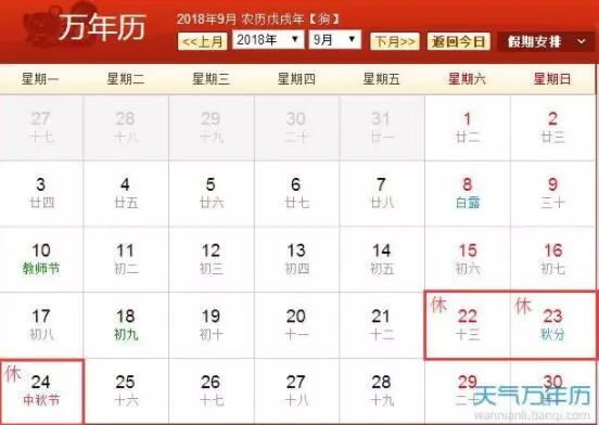 2018年中秋节是9月24日星期一。