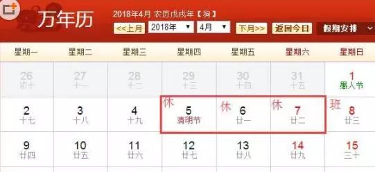 2018年清明放假安排:4月5日(清明节)4月6日(星期五)4月7日(星期六)放假,共3天。4月8日(星期日)上班。