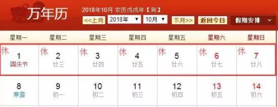 2018年10月1日至10月7日放假,共7天。