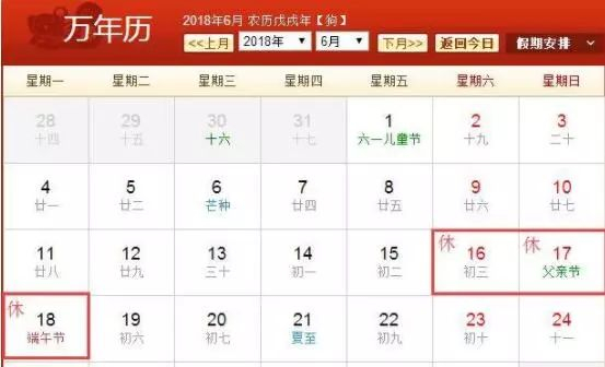2018年端午节是6月18日星期一。