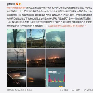 无独有偶,仅相隔数分钟后,演员佟大为同样通过微指出哈市秸秆焚烧问题严重,“满大街烧秸秆的味道,呼吸困难啊,请问哈尔滨的朋友们,冬天都这样吗?”