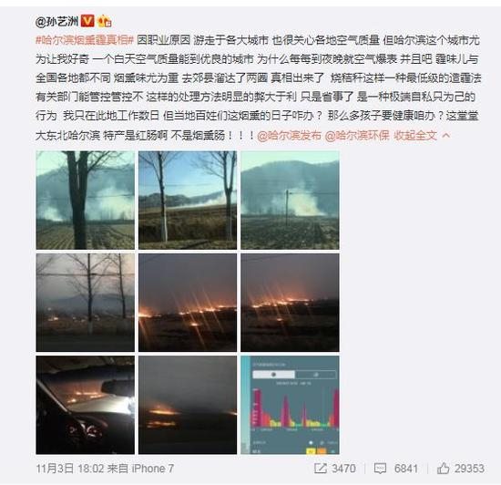 11月1日晚上10多,孙发微博质疑称哈尔滨空气质量差:“每到晚上整个城市都是烟火的味道,犹如全城在拍枪战大片,烟雾缭绕,谁有答案?”