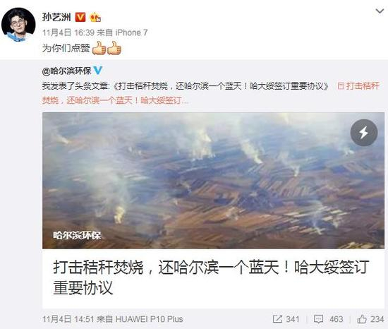 11月1日至3日,演员孙艺洲微博接连发文称哈尔滨市空气质量较差,并将矛头直指秸秆焚烧现象,引发公众关注,演员佟大为也通过认证微博呼吁哈市治理秸秆焚烧问题。