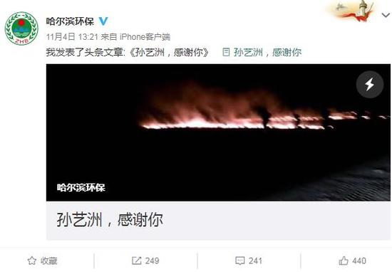 次日,哈尔滨市环保局通过其官微发文《孙艺洲,感谢你》,成为官方对此事件的第一次回复。